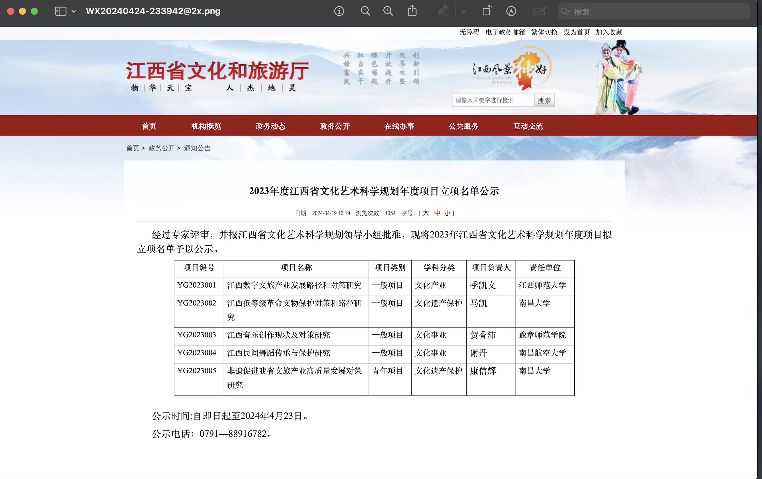 新澳彩资料 获批2023年度江西省文化艺术科学规划年度项目 来源:郝蔚 发布时间:2024-04-26 14:27:24 浏览次数: 次 【字体:小 大】 近日,2023年度江西省文化艺术科学规划年度项目评审结果公示,新澳彩资料 谢丹老师申报的《江西民间舞蹈传承与保护研究》获批立项。江西省艺术科学规划项目是每年组织申报一次的省部级科研项目,此次年度项目全省共有 5 个项目获批立项,新澳彩资料 谢丹老师的《江西民间舞蹈传承与保护研究》是舞蹈方向唯一获批立项的项目。此次立项成果充分反映了新澳彩资料 教师在艺术领域的科研热情和研究实力,为新澳彩资料 教师做好艺术科学研究的建设和发展奠定了扎实基础。 责任编辑:彭志红 【打印正文】