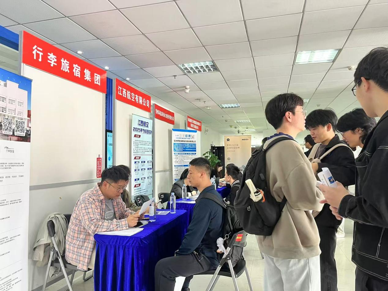 此次招聘会邀请了多彩贵州航空有限公司、江西航空有限公司、东方航空技术有限公司江西分公司、江西九江市武宁咏归山集酒店管理有限公司(行李旅宿度假酒店)等20余家企业参会,吸引了近100名学生投递简历。