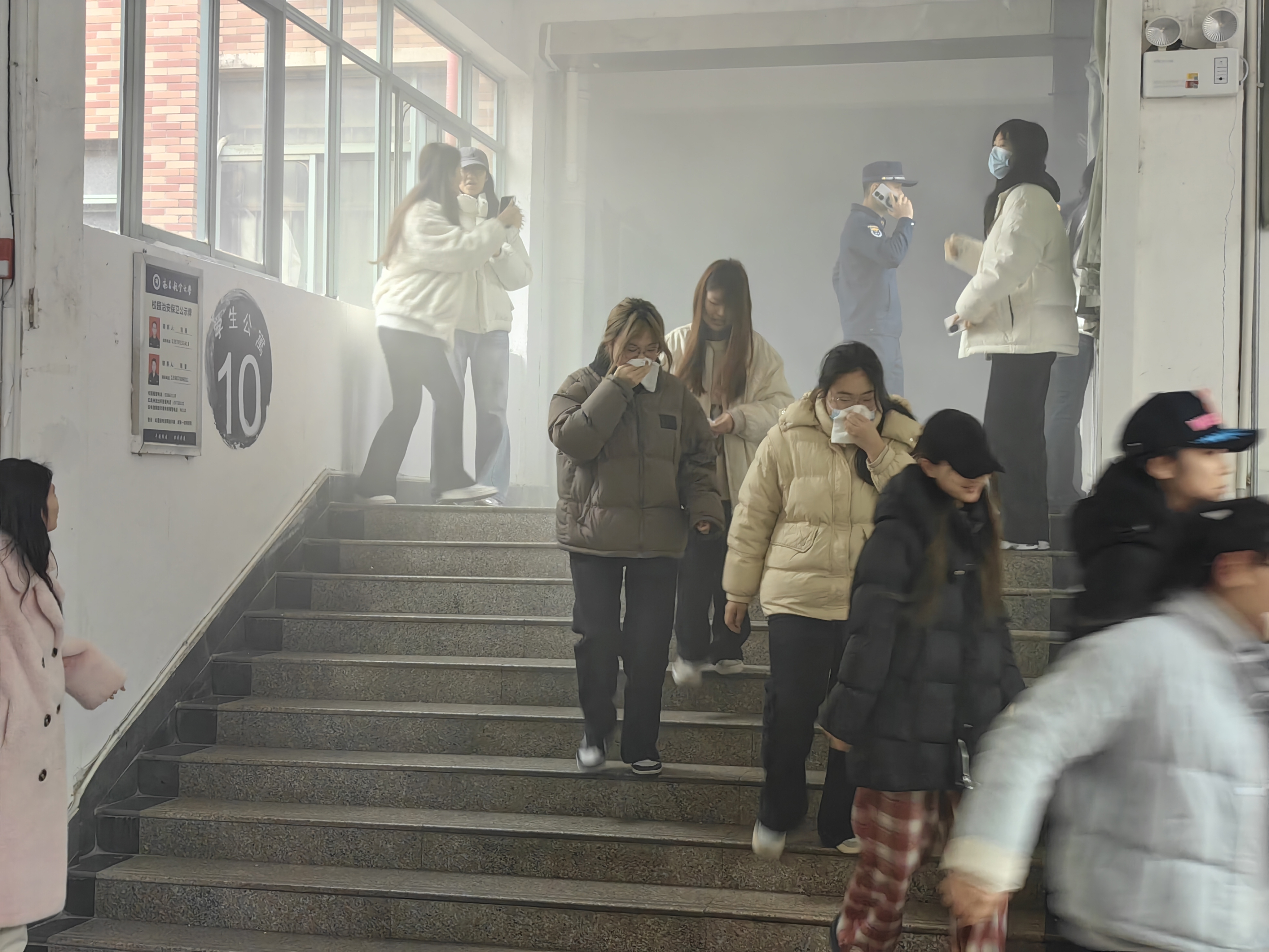 在学院学生宿舍10栋内开展消防疏散演练。随着警报声的响起,应急逃生疏散演练正式开始。学校保卫处值班人员迅速反应,按照火灾警情处置流程向值班领导反馈,第一时间联系学院、宿管,对师生进行有序疏散,并利用校园消防车对火情扑灭进行演练。学生10栋宿舍楼内浓烟滚滚,学生们按照讲座培训内容,用毛巾捂住口鼻向室外逃生,消防员、老师们积极引导,同学们积极配合,整个过程紧张有序,切实提升师生应急逃生避险的能力。